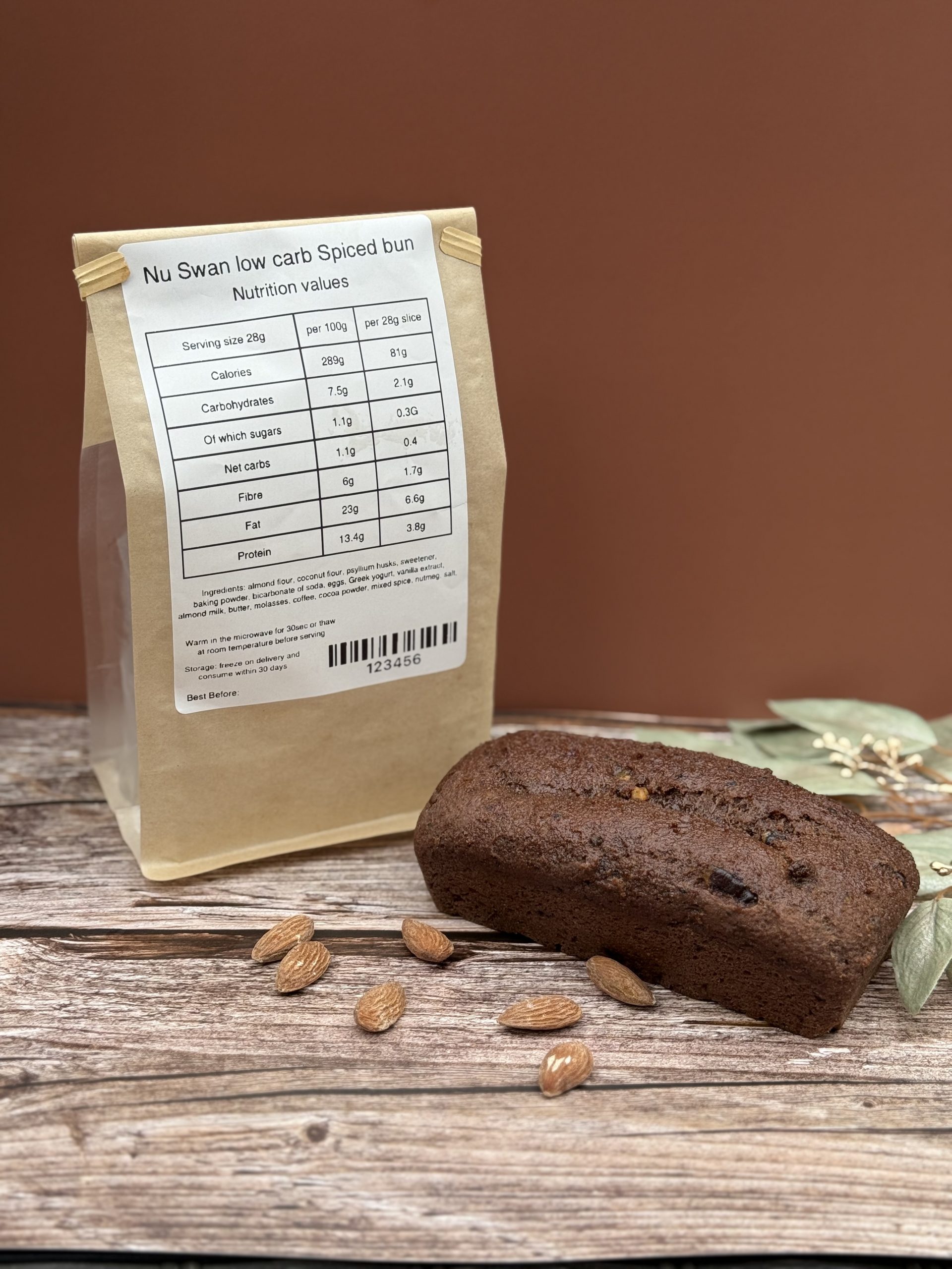 Spiced Bun, a low carb loaf made with gluten free ingredients Caribbean style spiced bun infused with warm island spices, walnuts, peacan nuts, cranberries, chocolate chips and natural sweeteners. Soft, moist, and richly aromatic, this loaf is perfect for guilt free indulgence with tea or cheese.