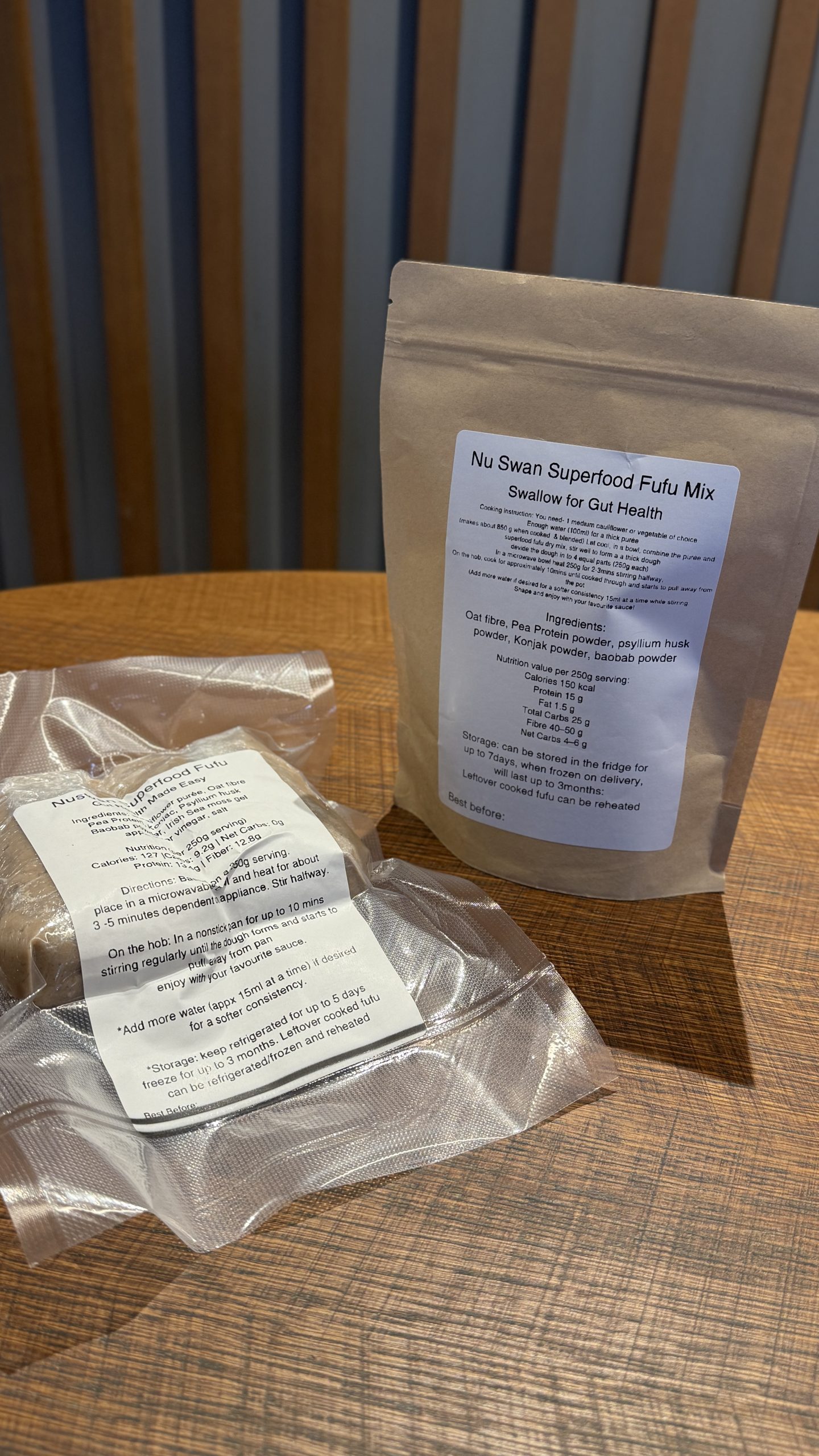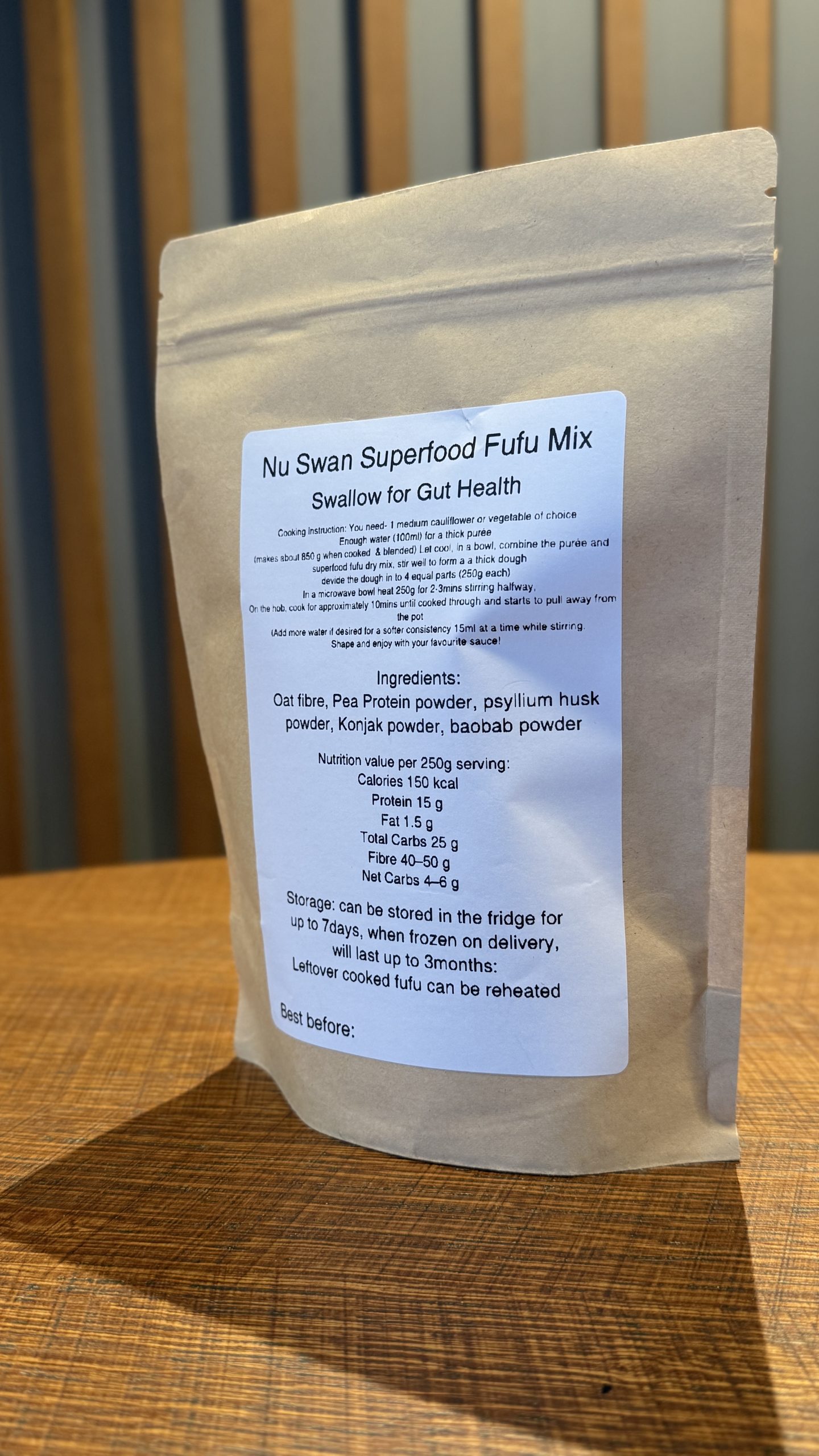 Nu Swan Superfood Fufu Dry Mix (150g). A low carb, protein rich dry mix formulated to create a traditional African fufu alternative. Made with pea protein, oat fibre, psyllium husk, baobab, and powder, it is designed for gut health and easy digestion. When mixed with cauliflower or vegetable purée of choice, it forms a dense, lightly stretchy fufu dough that can be paired with soups and sauces. Suitable for keto, diabetic-friendly, and health conscious diets.